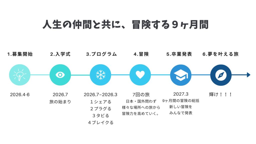 世界一周大学5期生は、2026/7.1−2027/3.31までの9ヶ月間のプログラムです。